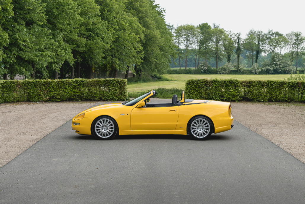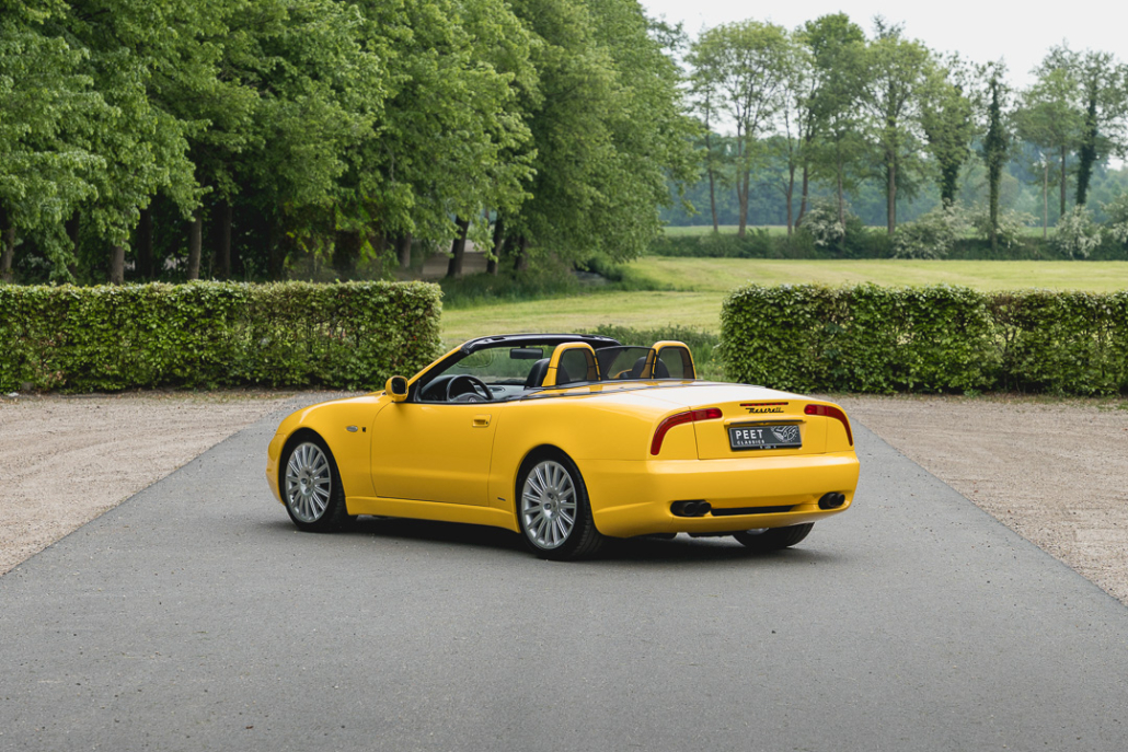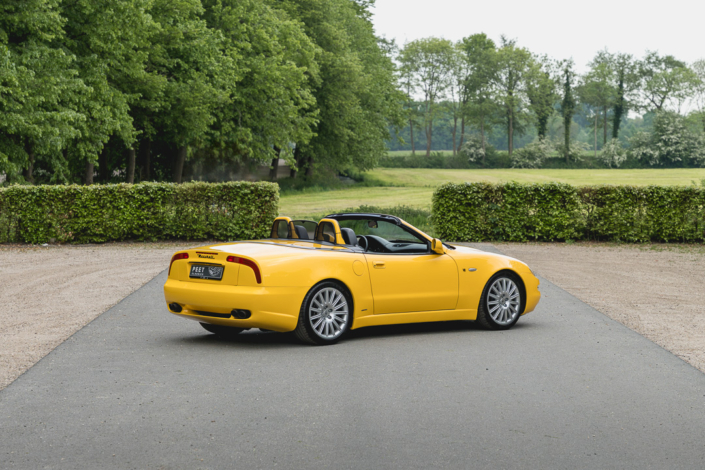 Dat komt niet alleen door de kleur, maar ook door de handgeschakelde zesversnellingsbak. Van de in totaal 3.889 ooit geproduceerde Spyders, werden 3.134 stuks verkocht als ‘Cambiocorsa’ wat in een totaal van slechts 574 stuks resulteert welke als handbak verkocht werden. Onze Spyder is in februari 2003 nieuw geleverd in Dubai conform de Europese specificaties uit die tijd. In Dubai is de Maserati lang in eigendom geweest van een uit Duitsland afkomstige liefhebber, die er medio 2020 afscheid van nam vanwege andere verplichtingen. Kosten noch moeite werden vervolgens gespaard door de nieuwe Nederlandse eigenaar, die de Spyder besloot tot in detail terug te brengen naar nieuwstaat inclusief diverse verbeteringen. Niet alleen werd de carrosserie volledig opnieuw gespoten in het oorspronkelijke ‘Giallo’, ook het cabriodak werd vernieuwd en nu voorzien van een glazen achterruit. Ook het onderstel werd volledig vernieuwd. Voor dit laatste werd gekozen voor veren van ‘Formula Dynamics’, welke het weggedrag in belangrijke maten verbeterd hebben. De auto ligt veel vlakker op de weg en helt bij bochtenwerk aanzienlijk minder over.